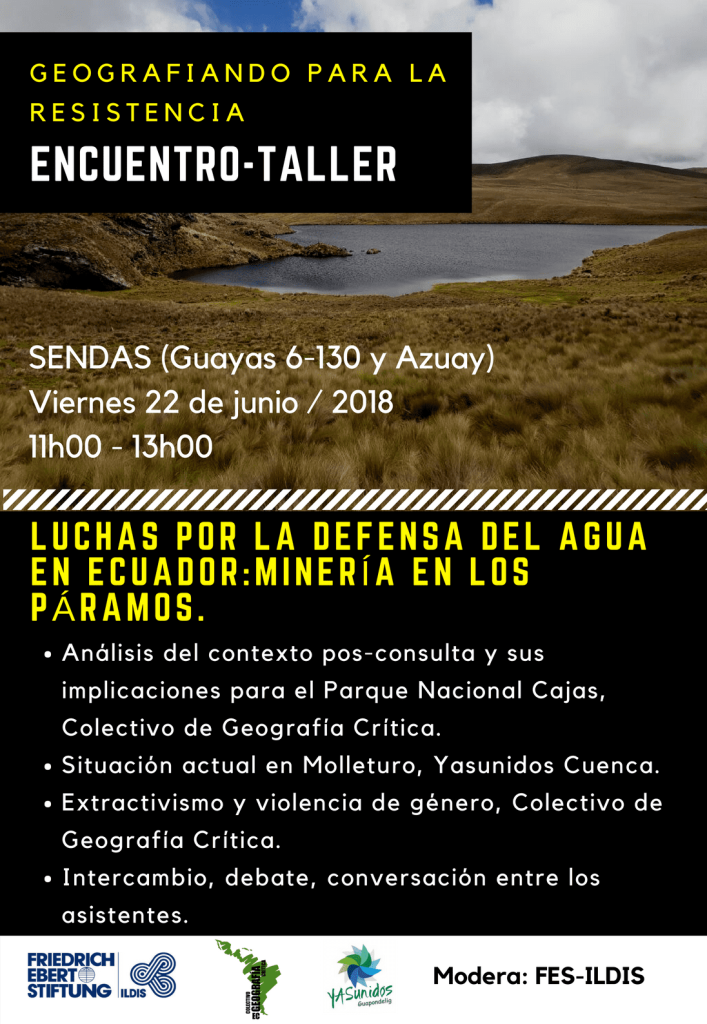 En Cuenca estaremos junto a los compañeros de Yasunidos Guapondelig y FES-ILDIS dialogando sobre las implicaciones de los resultados de la Consulta popular y Referéndum, donde el el 68,62% de los ecuatorianos y ecuatorinas votaron a favor de que se prohíba minería en áreas protegidas y centros poblados, a propósito del texto escrito por Melissa Moreano con apoyo de Manuel Bayón y Alberto Fernández, integrantes del Colectivo (al que se puede acceder aquí). Luego conversaremos sobre la situación actual en Molleturo, donde el proyecto minero Río Blanco ya ha provocado situaciones de violencia hacia los habitantes locales. Finalmente, compartiremos nuestras reflexiones sobre las afectaciones diferenciadas por género del extractivismo y nuestras cartillas “Los feminismos como práctica espacial” y “Territorio y comunes: utopías y desafíos”