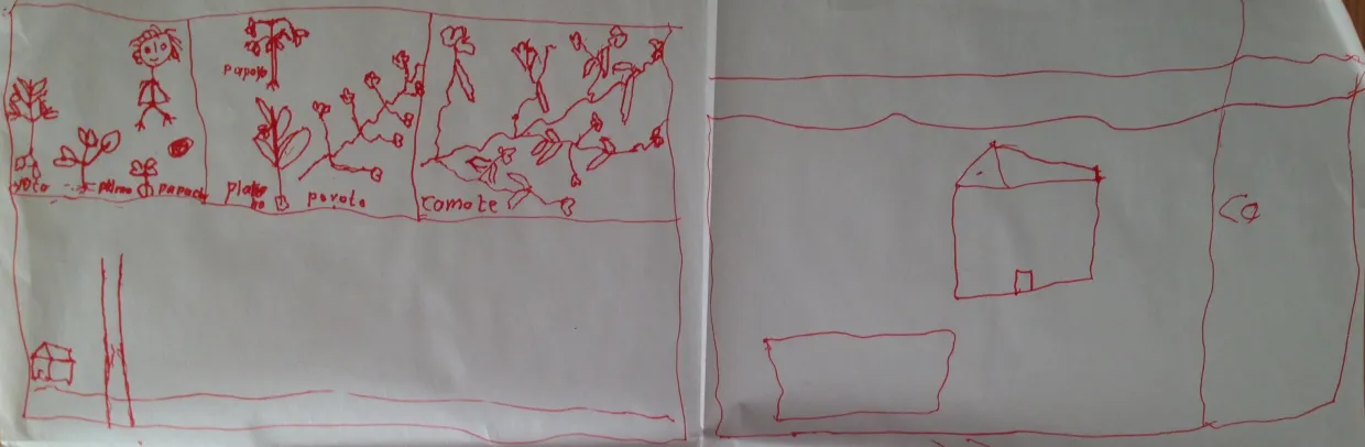 De todas formas, los dibujos del territorio de la comunidad muestran pistas claras: las huertas, los animales, la escuela, la vida campesina que se re-territorializa. La comunidad está linda, habitada, llena de niños. Las tomas de agua tienen líquido abundante, los limoneros ya dan limones, se organizan fiestas y asambleas en las que se recrea la vida comunitaria. Una compañera nos cuenta que ha sembrado fréjol negro y se ha dado. Nos pide semillas. La comunidad, pese al trauma y la amenaza latente de la megaminería, se re-instala.