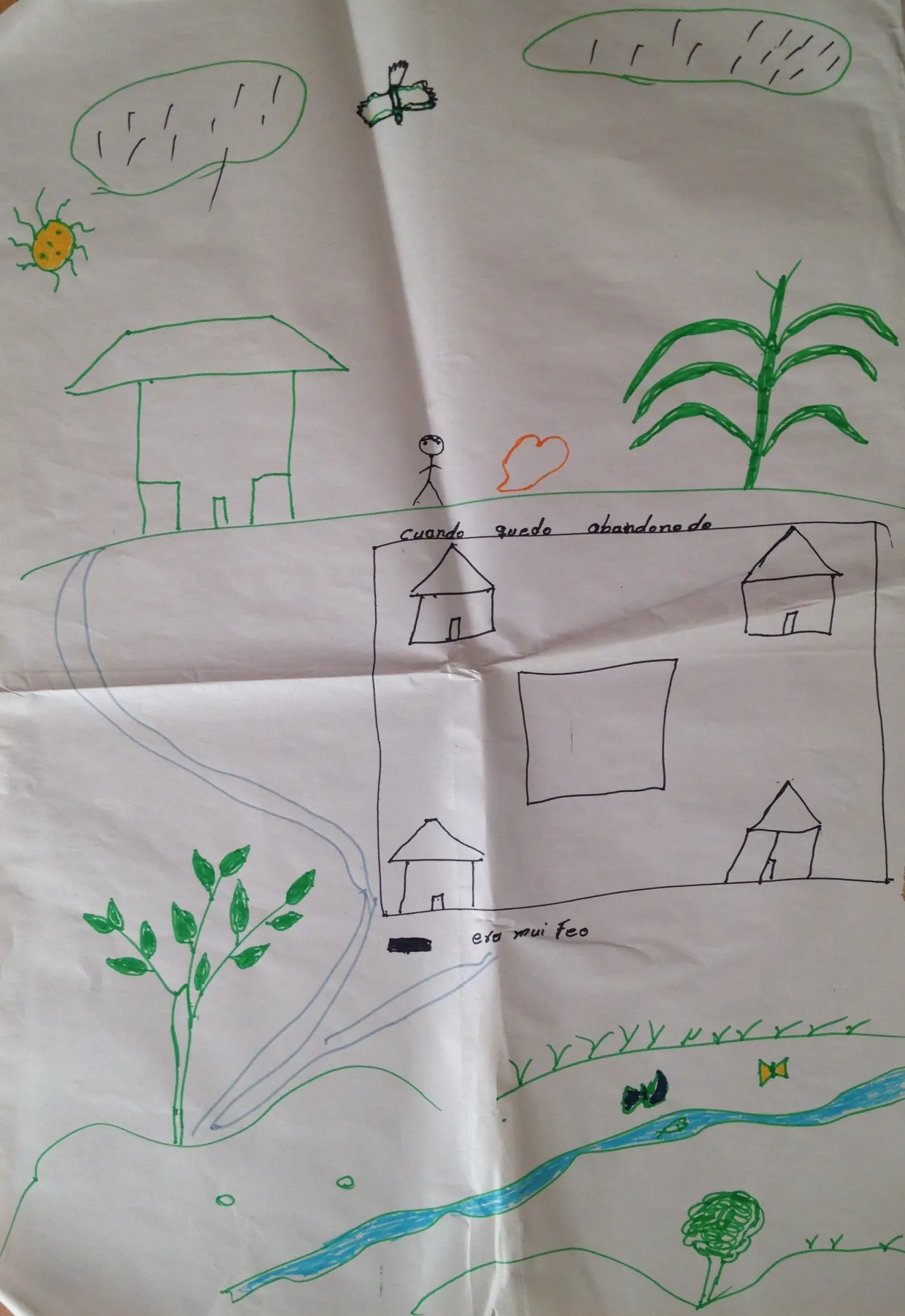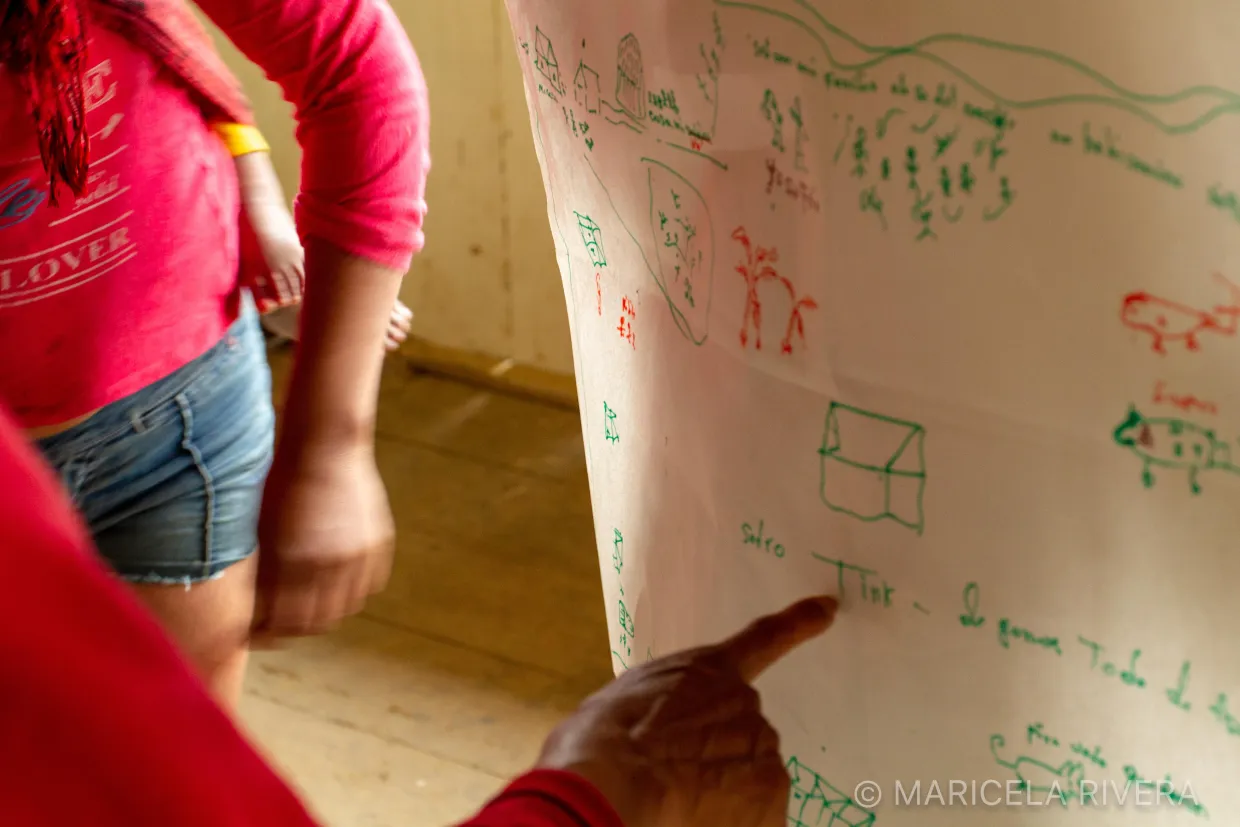 Los mapas que dibujaron las mujeres muestran que el miedo sigue presente. Aunque les pedimos que dibujen la comunidad soñada, el relato del desalojo, los meses que vivieron como refugiadas en otras comunidades, y el susto del regreso, siguen siendo los elementos centrales en los dibujos. Y el responsable es el estado.