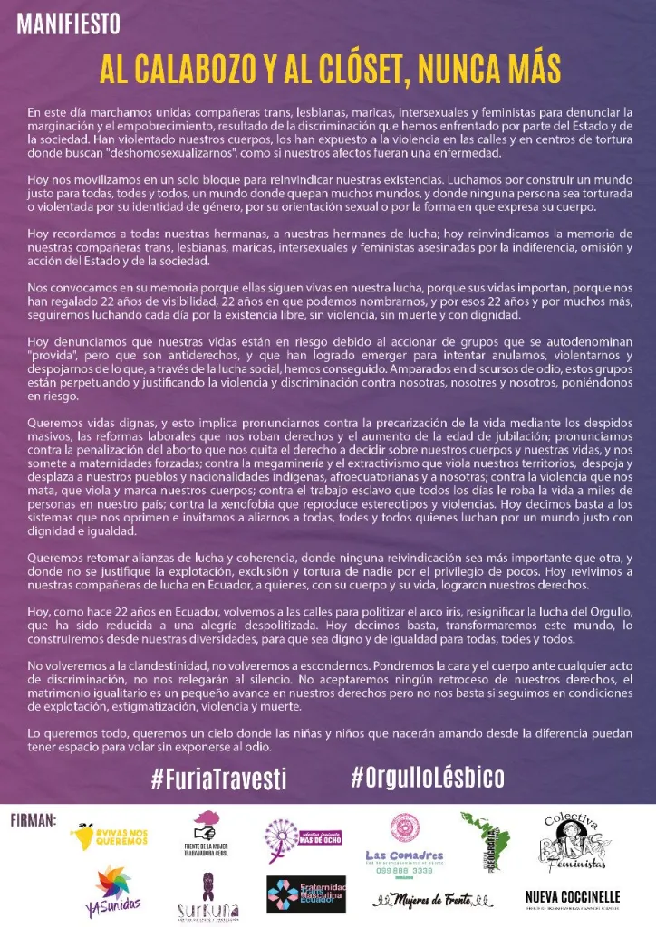 Manifiesto #FuriaTravesti #OrgulloLésbico del que participa el Colectivo: