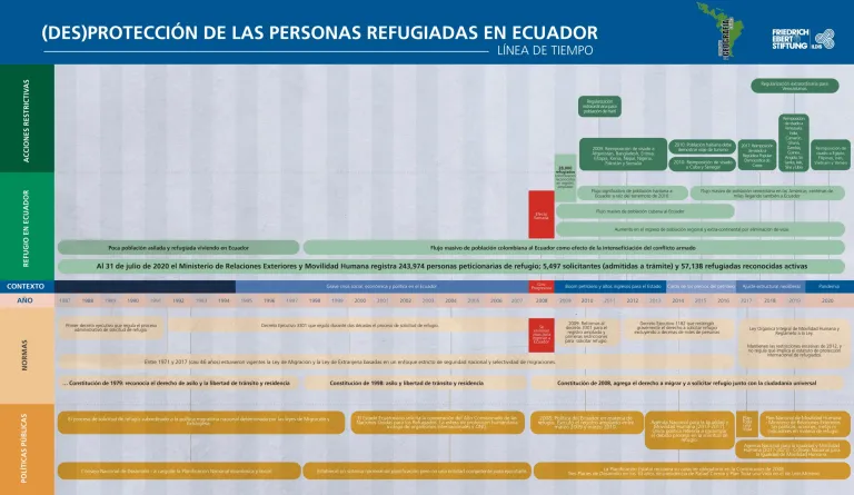 La publicación se sintetiza en dos infografías, por un lado una línea del tiempo para comprender de un vistazo la evolución y vicisitudes en el refugio en Ecuador: