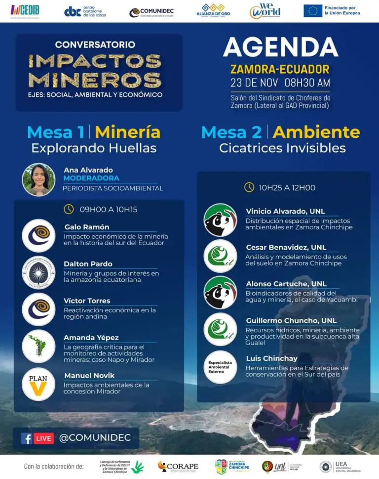 El evento se realizará en la ciudad de Zamora, el día 23 de noviembre del 2023, en el salón del Sindicato de Choferes de Zamora (Junto al GAD Provincial de Zamora Chinchipe) y será visible en línea en el Facebook de COMUNIDEC, quienes son organizadores del evento junto a CONSEJO DE DEFENSORAS Y DEFENSORES DE LOS DERECHOS HUMANOS Y DE LA NATURALEZA DE ZAMORA CHINCHIPE, CORAPE Coordinadora de Medios Comunitarios, Populares y Educativos del Ecuador , Universidad Nacional de Loja y la Universidad Estatal Amazónica.