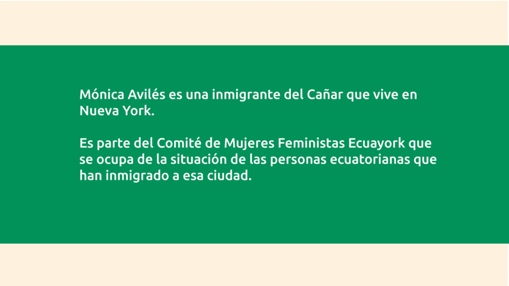 Mónica Avilés es una persona clave en la organización de las familias ecuatorianas en EEUU. En el siguiente video nos muestra su visión sobre el proceso migratorio tras el feriado bancario, y su análisis sobre la dinámica actual de movilidad y relación con el Estado ecuatoriano. Mónica fue clave en la cartilla sobre la diáspora ecuatoriana. Les dejamos este video realizado por el documentalista Manolo Sarmiento para el colectivo, con el apoyo de FES-ILDIS: