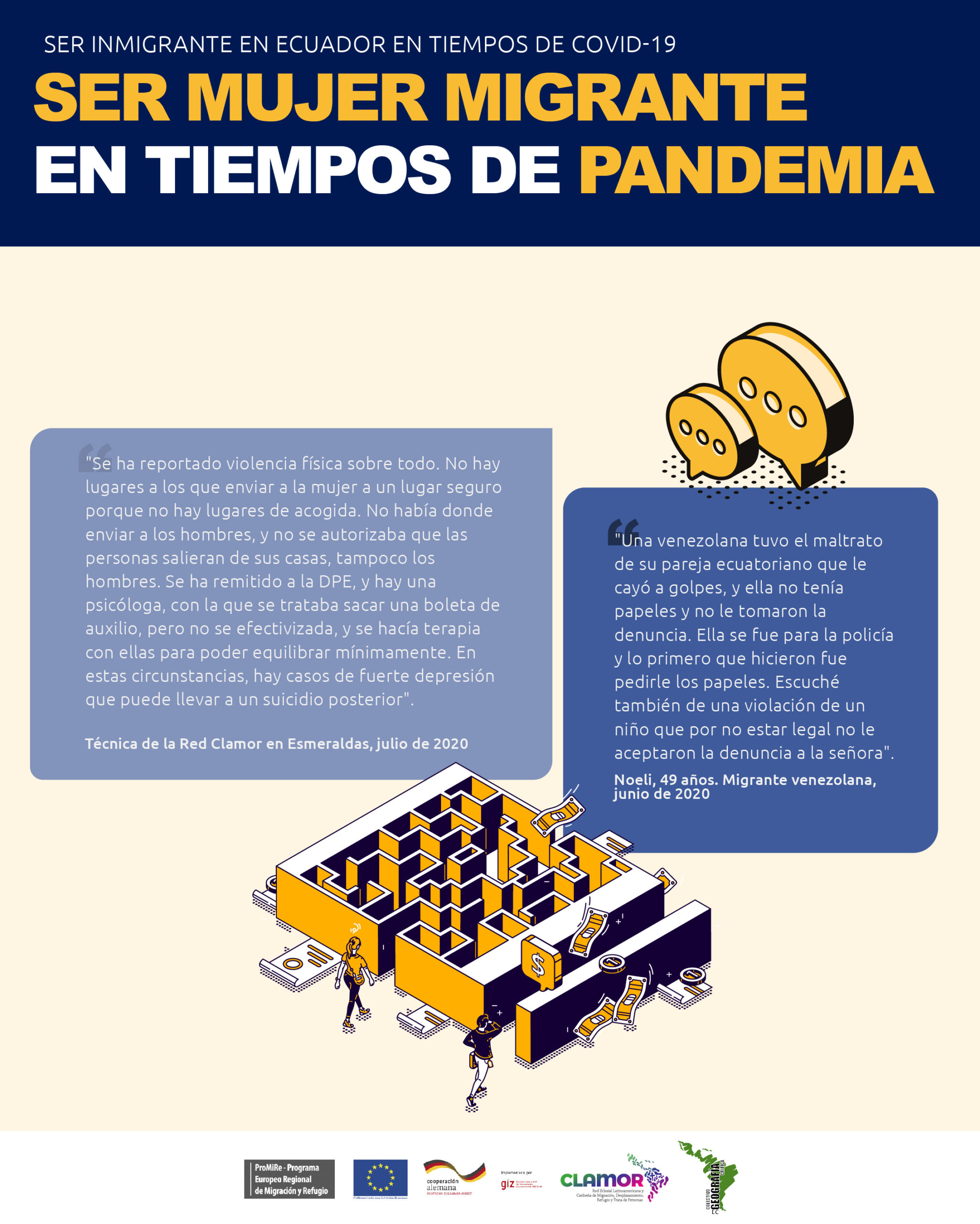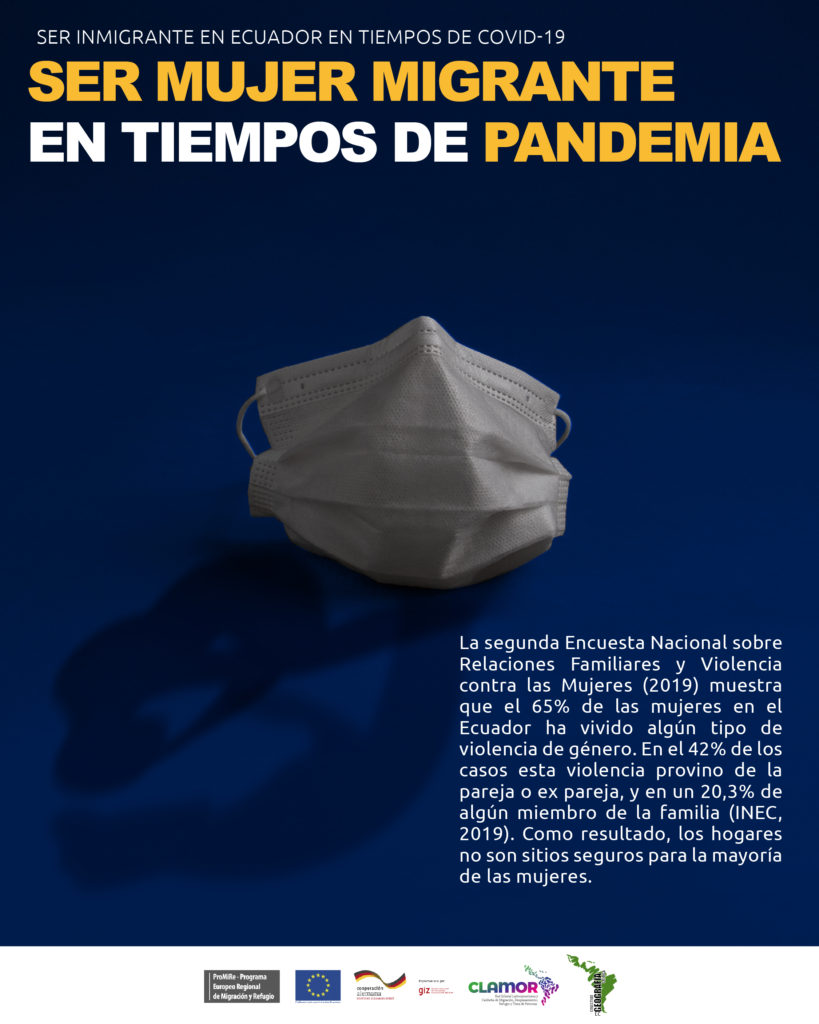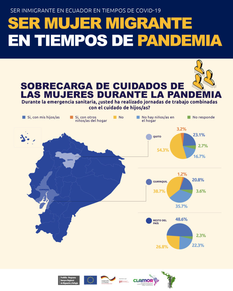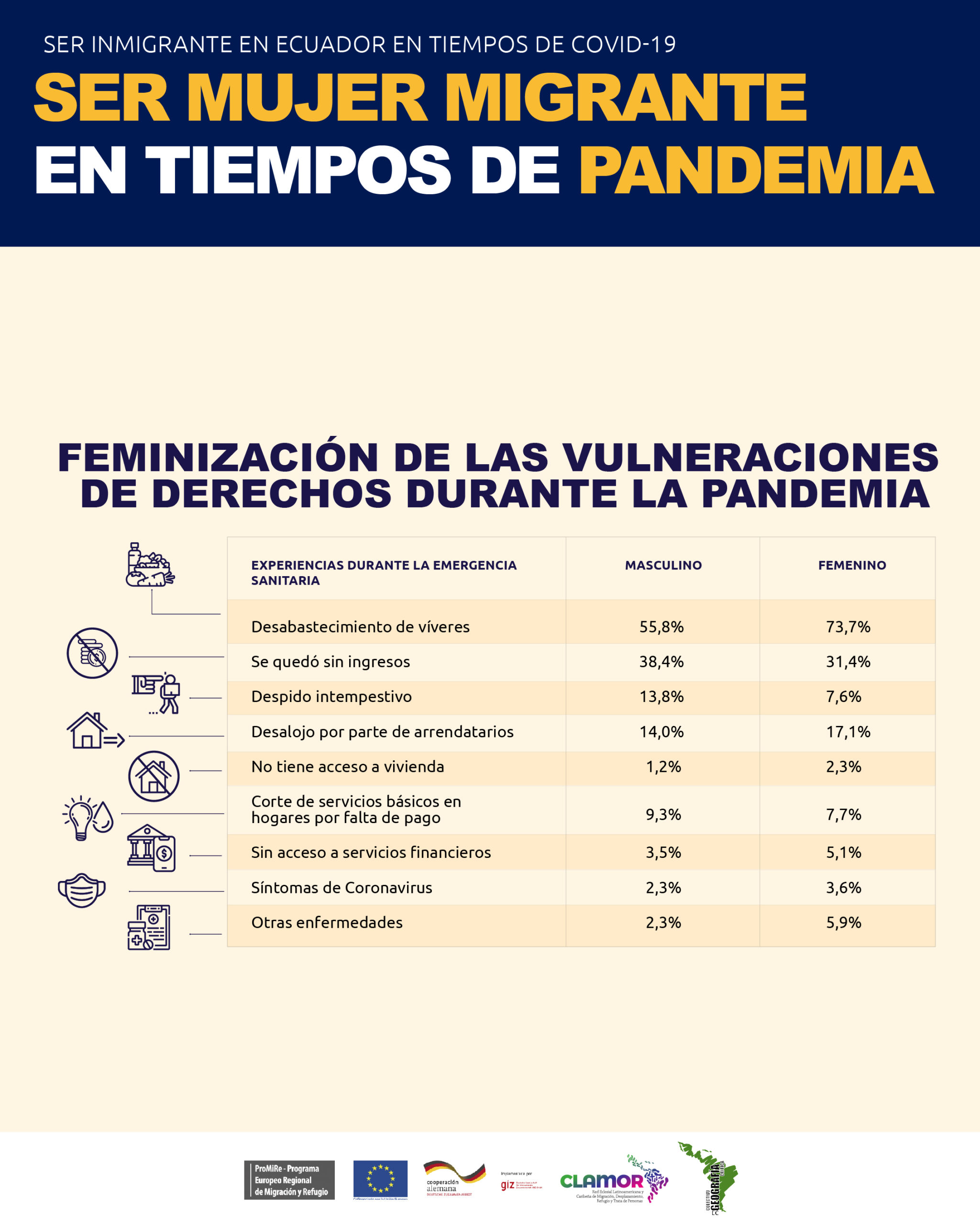 Infografía que muestra cómo los datos de la encuesta develan que la pandemia ha sido más dura con las mujeres migrantes en los diferentes indicadores.