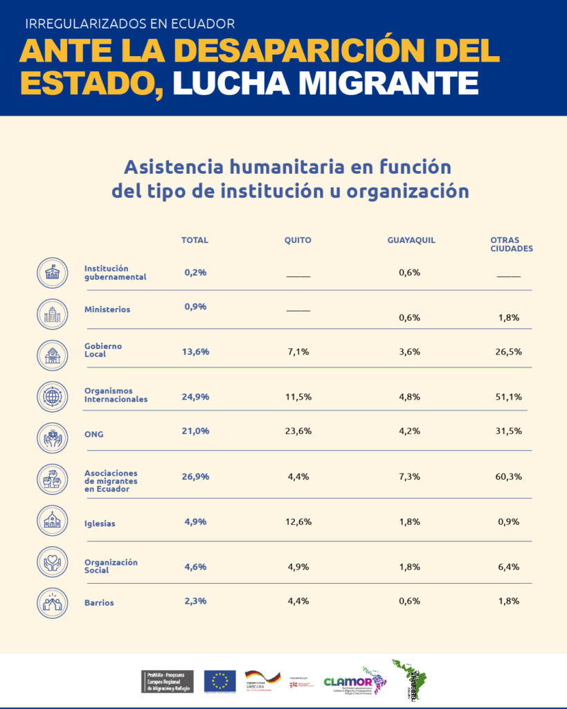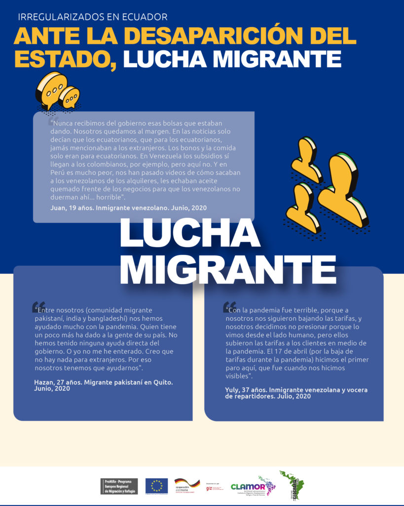 Infografía que muestra cómo la desatención estatal durante la pandemia a la población en situación de movilidad en Ecuador, ha tenido como respuesta mayoritaria las redes de apoyo mutuo de las personas migrantes.